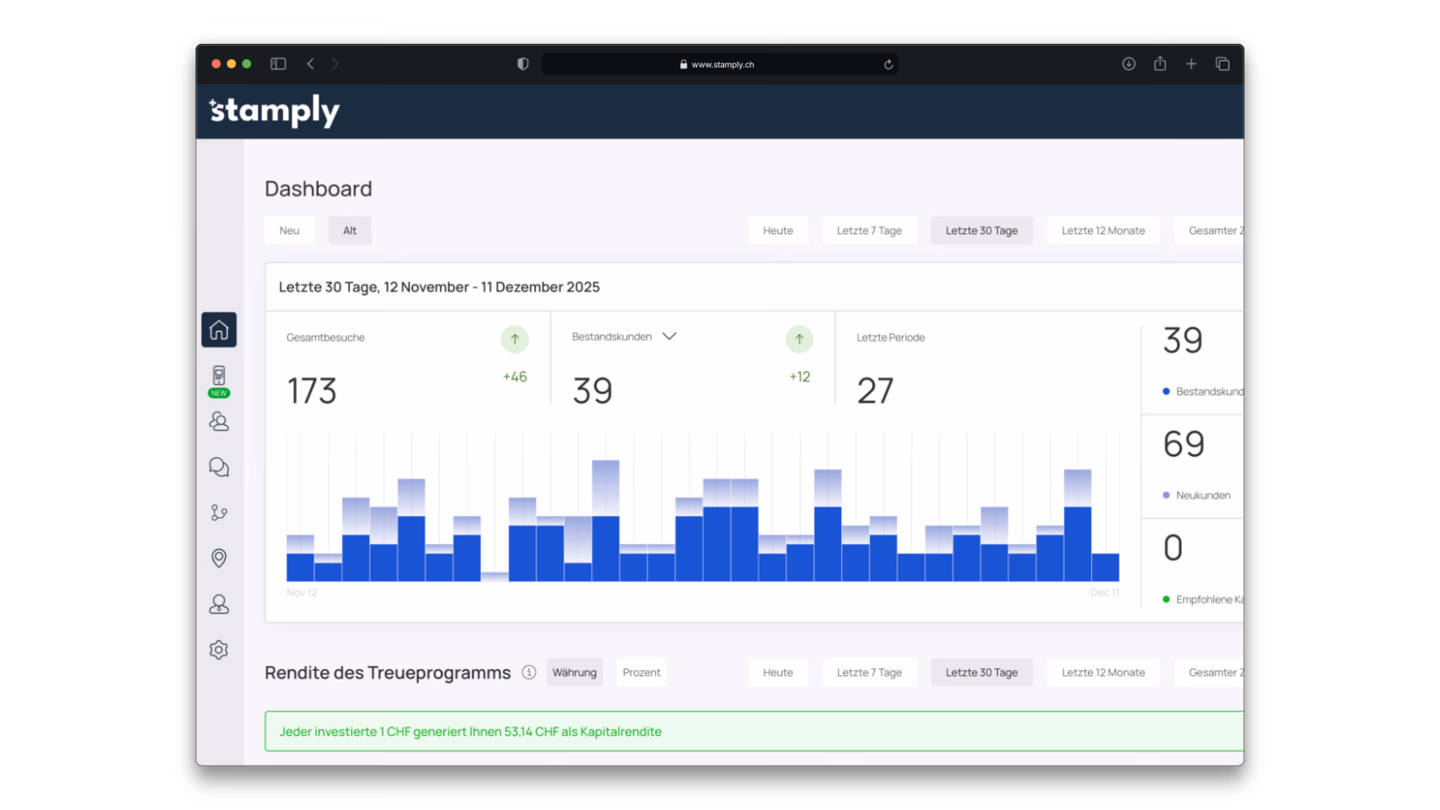 Stamply zeigt dir wie viele Stammkunden du hast, wie oft sie zurückkommen und wie viel Mehrumsatz sie bringen. Messbare Ergebnisse statt Bauchgefühl.